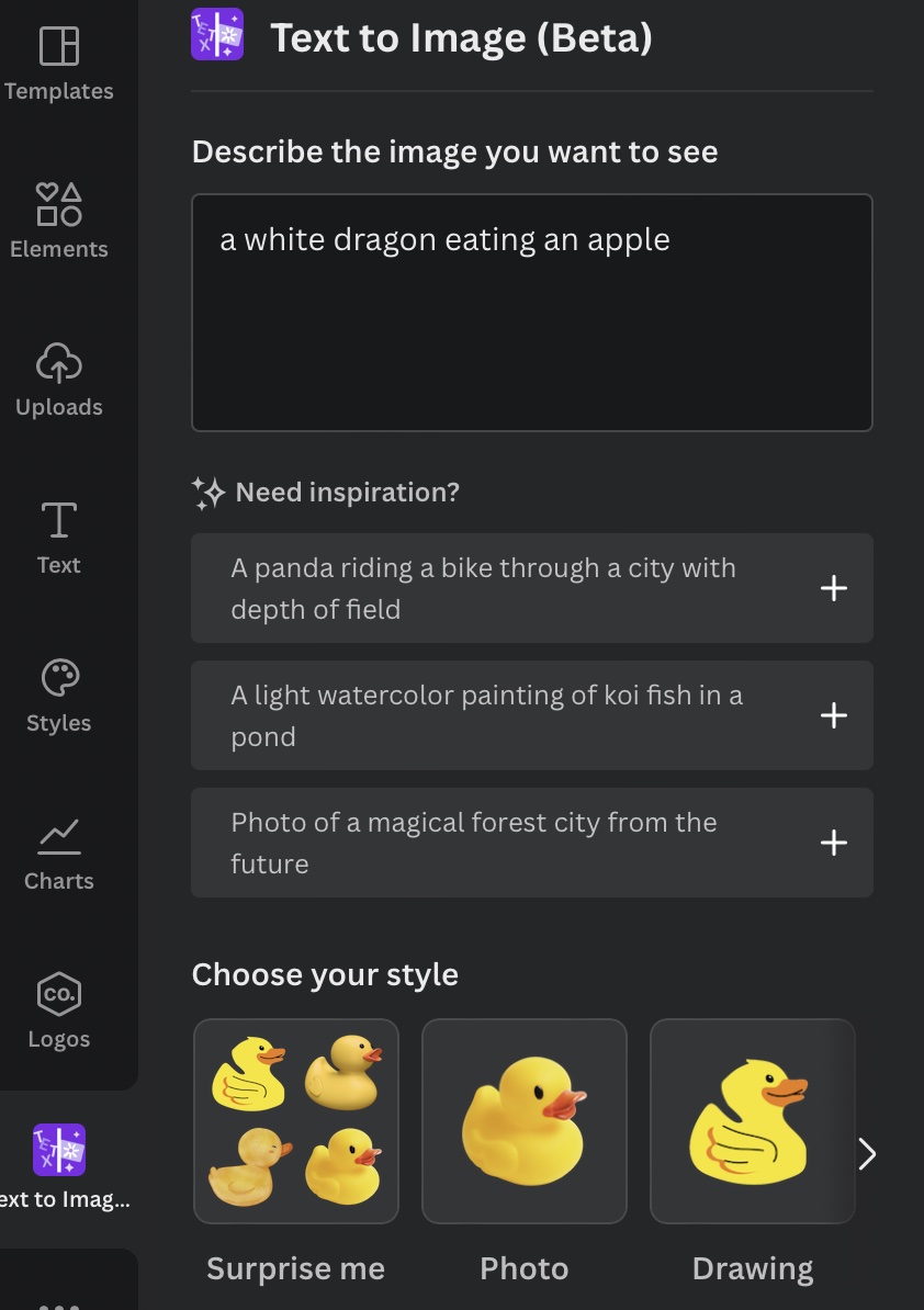 En la función Texto a Imagen de Canva, podés escribir la descripción de la imagen que querés que Canva diseñe y en cuestión de segundos la tendrás lista!